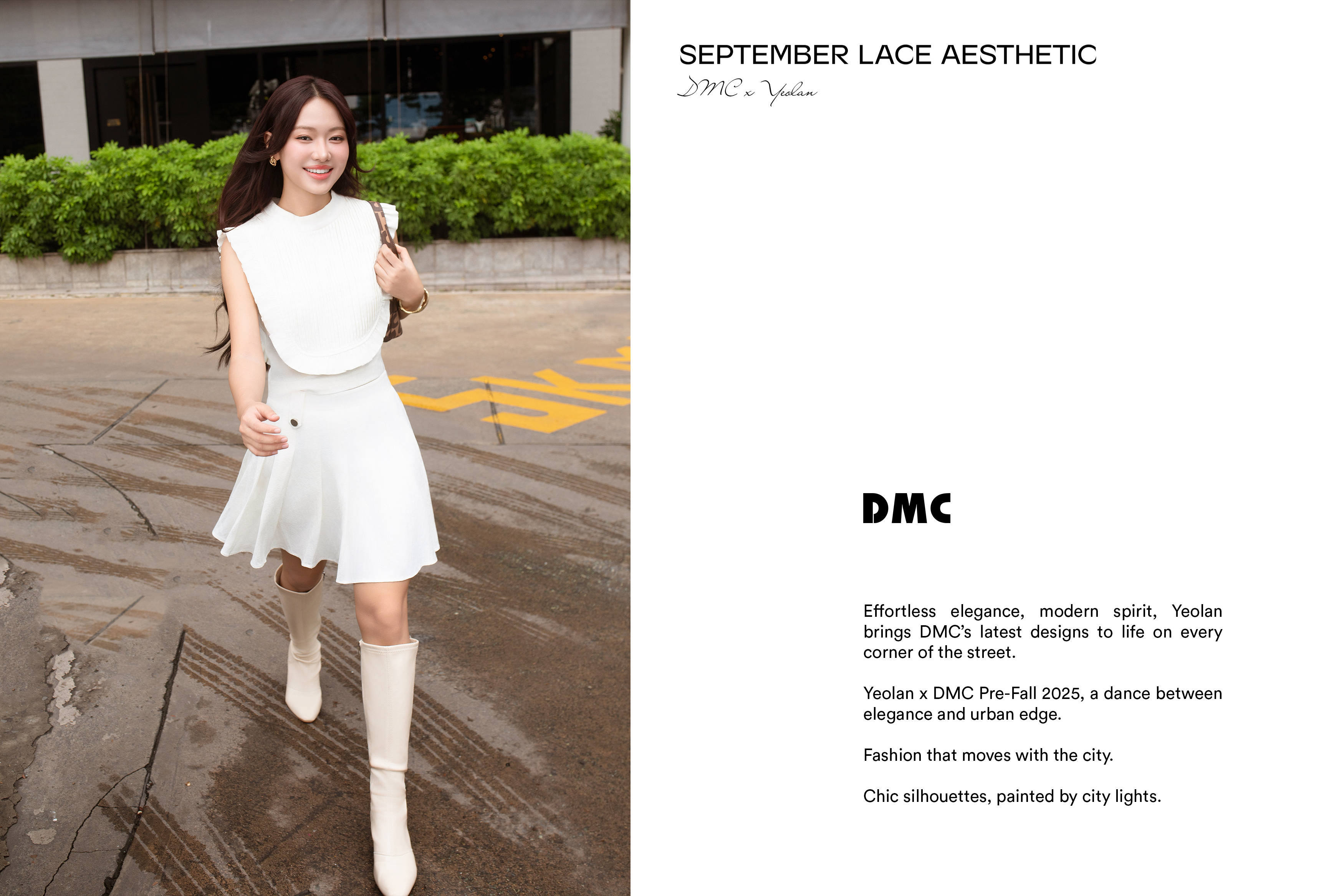 Từng chi tiết trong bộ sưu tập đều được chăm chút tinh tế, vừa tôn lên vẻ sang trọng vốn có của ren, vừa thổi vào hơi thở hiện đại nhờ sự kết hợp linh hoạt giữa chất liệu và phom dáng. Yeolan xuất hiện rạng rỡ, tự tin và tràn đầy năng lượng, đúng với tinh thần thế hệ mới mà DMC muốn mang tới: dám khác biệt, dám toả sáng theo cách riêng.